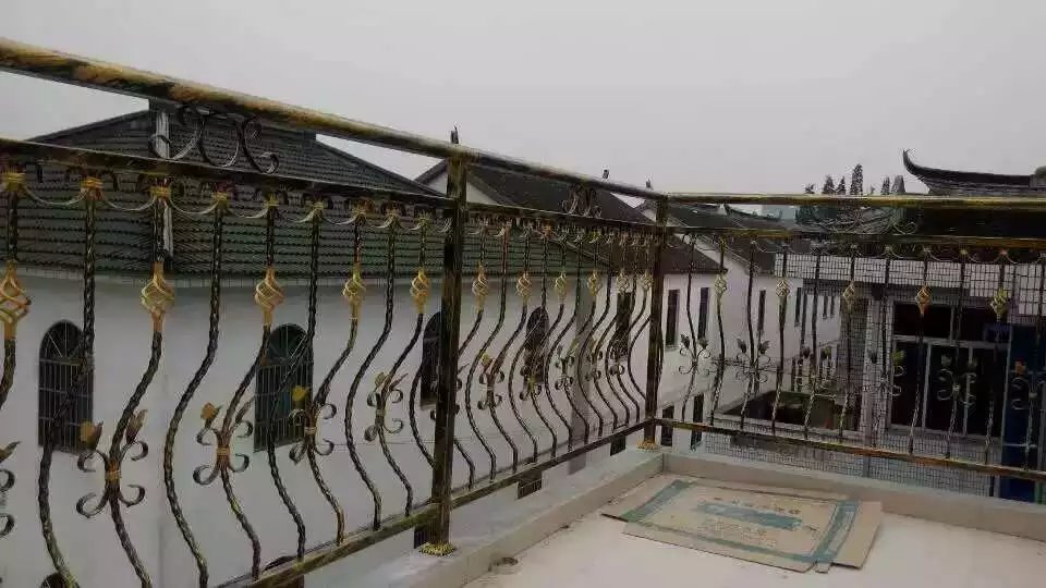 欄桿的設(shè)計(jì)非常華麗,采用了復(fù)雜的卷曲花紋和裝飾圖案。欄桿的顏色為黑色,并且在關(guān)鍵部位有金色的裝飾,增加了整體的豪華感。