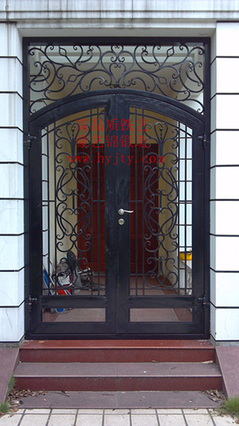 該款編號為TY-JHM13的鐵藝門是無錫鐵藝護欄廠為別墅庭院設計的一款高檔豪華的鐵藝門。該款鐵藝門材料搭配美觀合理,選材穩定,容易鍍鋅。由常年從事鐵藝制造工作的專業技師經手工鍛打、加熱、彎曲造型、拋光、節點特殊處理、硝基油漆等工藝制造而成。該鐵藝門美觀大方而又不失厚重感,門體上面的兩個圓及其內部和上部裝飾物提升了大門的整體效果。其花葉和裝飾物配件都經過精挑細選、稱得上是獨出心裁,安裝合理。可作為別墅庭院大門的首選。