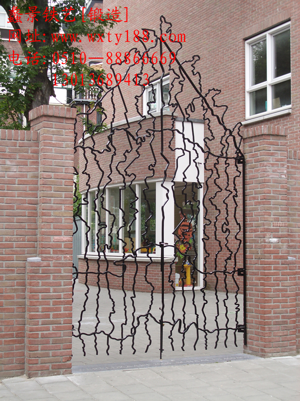 該款編號為TYM-012型號的鐵藝門是無錫鐵藝護欄廠鐵藝為別墅、庭院、花園而設計制造的一款現代非主流的鐵藝大門。該鐵藝門運用凹凸沒有規律的曲線作為欄桿,保留門的造型和外框。沒有規律的曲線的交錯上演了極其擁有創造力的場景。門不像門,像是從漫畫里走出來的城堡。讓人覺得可愛、可笑。這是一道風景,別有用心的吸引了人們的視線。從門的每個地方都可以看出活潑、天真、想象、創造……,此門看似簡單,實則繁雜,線條似乎是沒有規律的,但是當組成門的時候,又不能不協調,所以處處透露著工匠的細心。